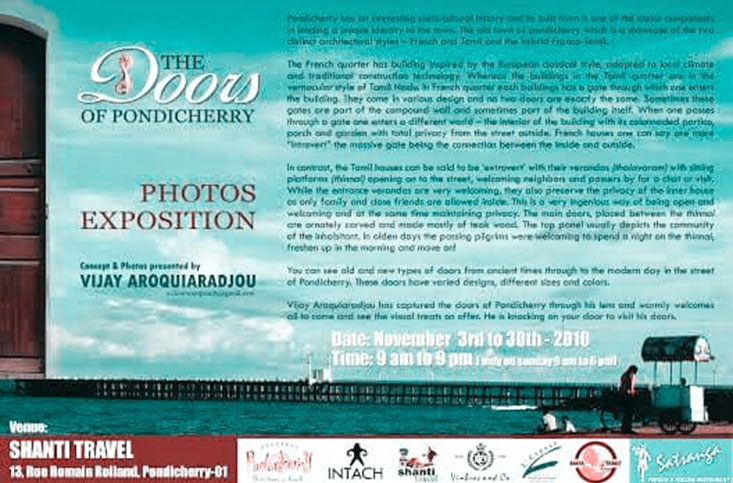 In 2010, with the generous support of Mr. Mathew Samuel, the former Director of Pondicherry Tourism, we organized “Doors of Pondicherry,” a captivating photo exhibition hosted at Shanti Travel, 13 Roman Rolland Street. The inauguration of this exhibition was graced by Thiru. N. Rangasamy, the then Chief Minister of Puducherry. It was during this event that “DoorwaysPondy.com” website came into existence.