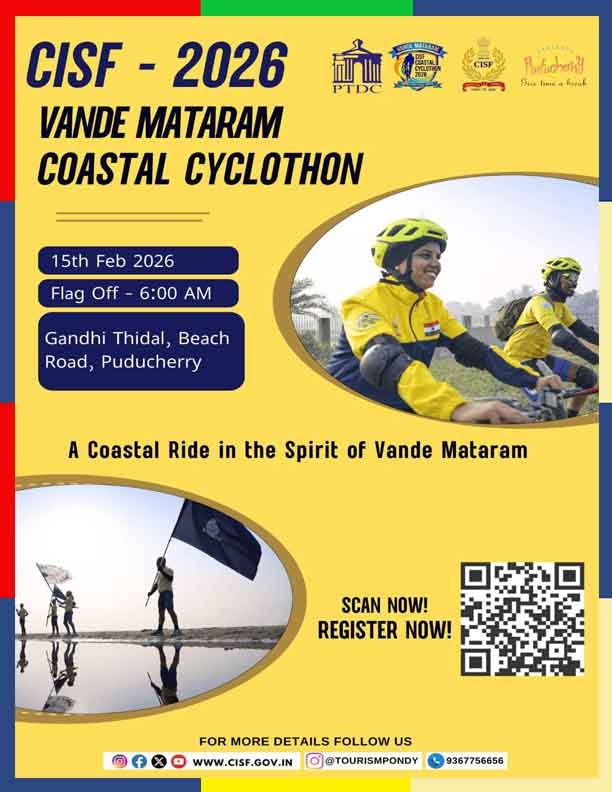 11 Feb CISF – VANDE MATARAM COASTAL CYCLOTHON 2026 Posted at 08:31h in Events by venkat raman 0 Comments CISF – VANDE MATARAM COASTAL CYCLOTHON 2026 A Coastal ride in the spirit of Vande Mataram.———————–Date: Feb 15TH – 2026Time: 6:00 AM.Location: Gandhi Thidal, Rock Beach, Puducherry, 605001.Entry: Scan for register.———————–Tags: #events #pondyevents #pondyhappenings #hotel #food #exhibition #artexpo #artgallery #tourismevents #nightlife #tours #culturals #artnculture #puducherry #unlockpondy #doorwayspondyShare Print page 9 Likes