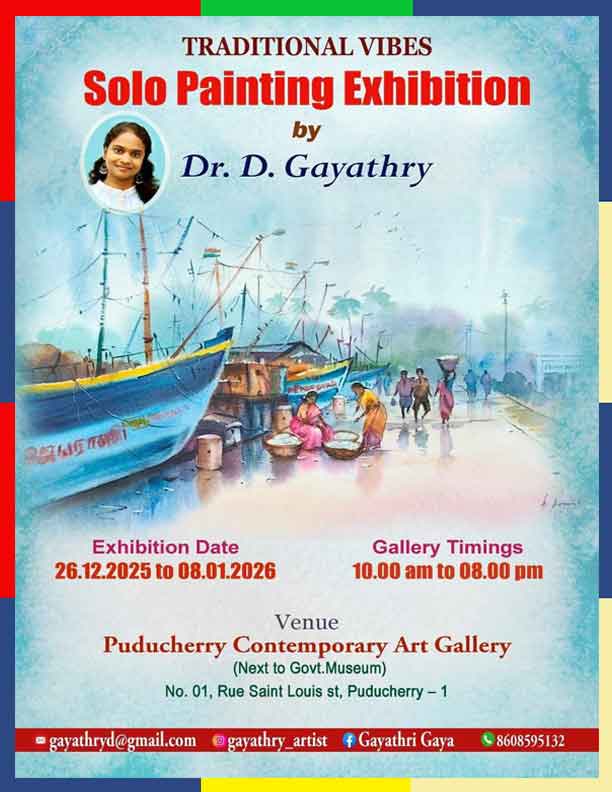 26 Dec Watercolour Painting Exhibition Posted at 17:14h in Events by venkat raman 0 Comments “Traditional Vibes” Solo Show BY Dr. D. Gayathry. Watercolour Artist.———————–Dates: 26th December 2025 to 8th January 2026Gallery Timings: 10.00 AM – 8.00 PMLocation: Puducherry Contemporary Art Gallery, Saint Louis Street, Near Pondicherry Museum. 605001.———————– Tags: #events #pondyevents #pondyhappenings #hotel #food #exhibition #artexpo #artgallery #tourismevents #nightlife #tours #culturals #artnculture #puducherry #unlockpondy #doorwayspondyShare Print page 9 Likes